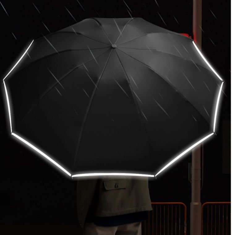 夜間の視認性を高める反射テープを骨部分に配置した晴雨兼用の折りたたみ傘です。