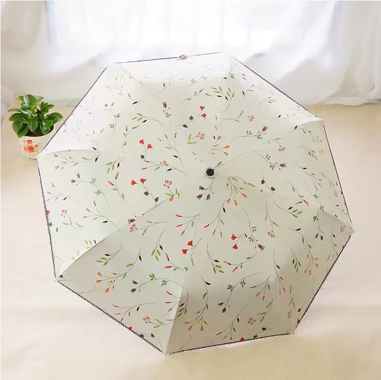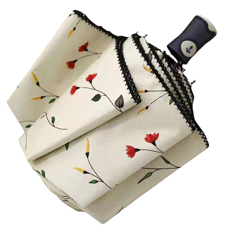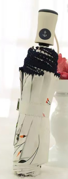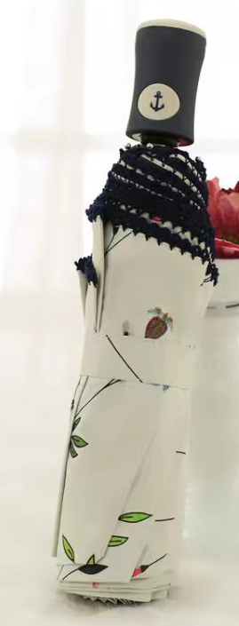 繊細な花柄とレース装飾が美しい折りたたみ傘の日傘です。