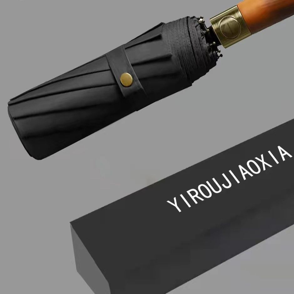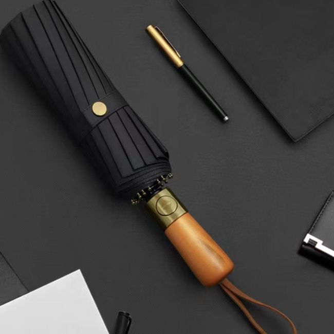 天然木の持ち手と真鍮色の金具が織りなす上品なデザインの晴雨兼用折りたたみ傘です。