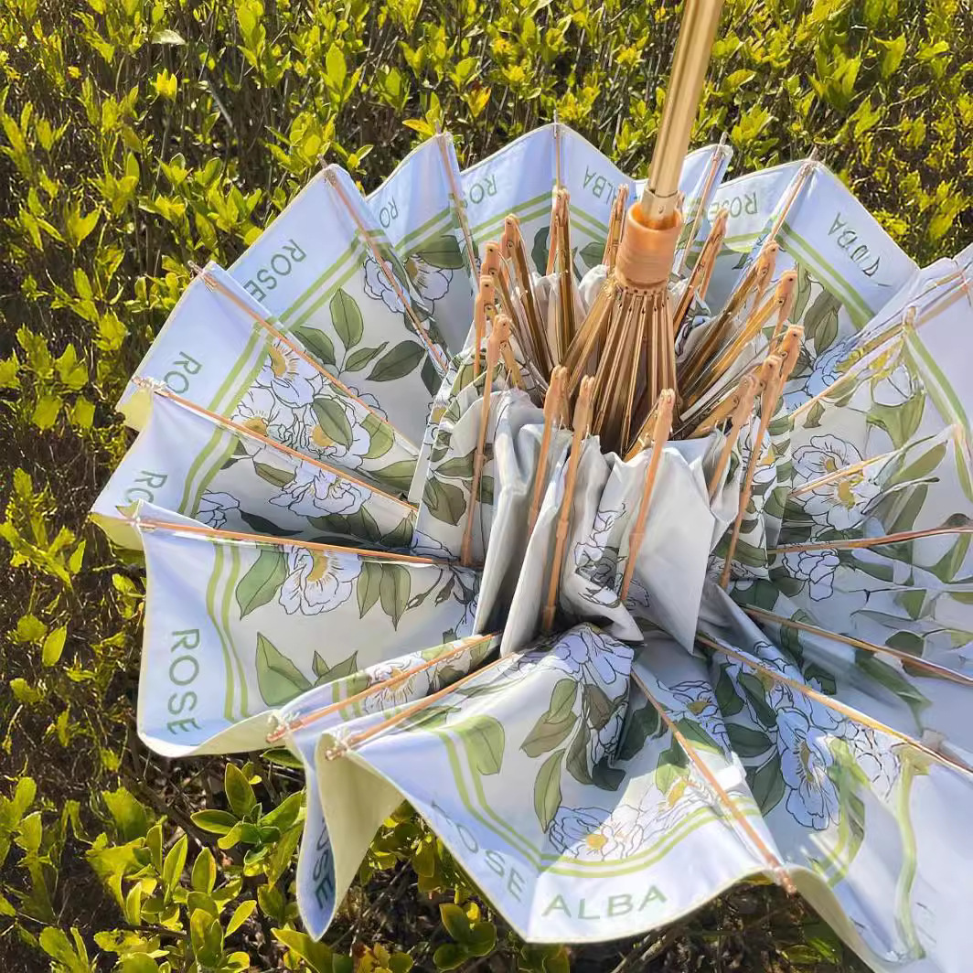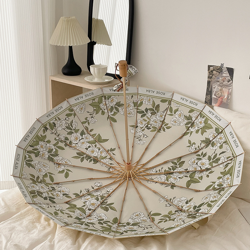 繊細な薔薇と葉のデザインが美しい折りたたみ傘の雨傘です。