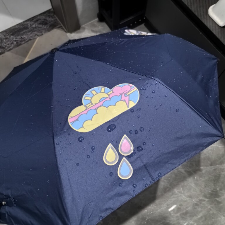 傘面には太陽と雲、カラフルな雨粒の模様があしらわれており、雨傘としての機能性と癒しのデザインを両立しました。