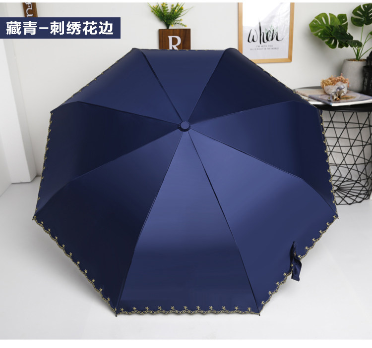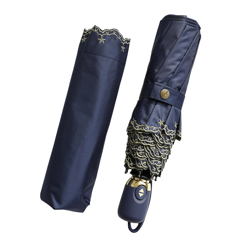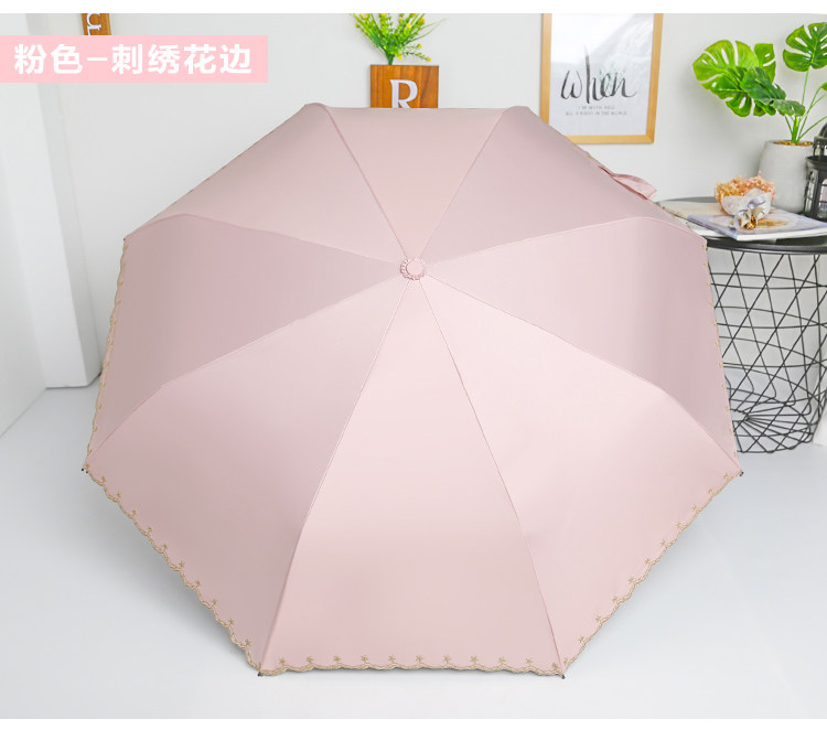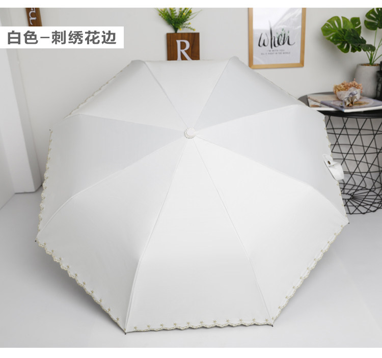 繊細な花柄刺繍とレースのような縁取りが美しい晴雨兼用の折りたたみ傘です。