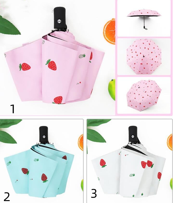 可愛い果物柄がポイントの自動開閉式折りたたみ傘です。 紫外線カット機能付きで晴雨兼用としてご利用いただけます。 軽量設計でコンパクトに収納でき、持ち運びに便利な折りたたみ傘です。